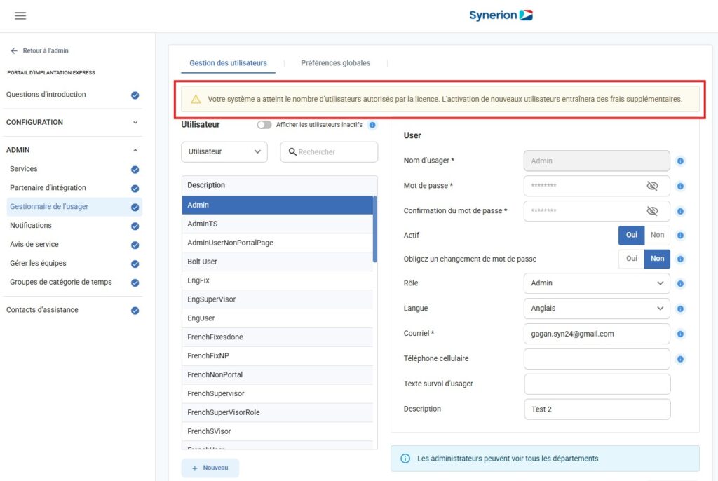 Si vous avez atteint la limite de licences d’utilisateurs disponibles dans votre système Synerion Agile, un message d’avertissement s’affichera sur la page Gestionnaire des utilisateurs.