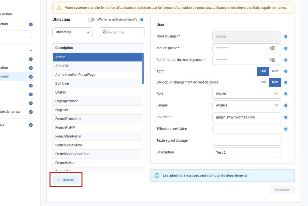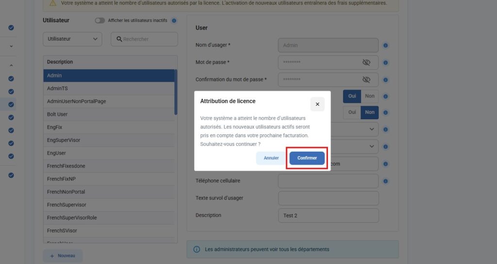 Lorsque vous cliquez sur le bouton Nouveau, ou sur Oui pour réactiver un compte utilisateur inactif, un message s’affichera pour informer l’utilisateur de la limite de licences et des coûts supplémentaires qui pourraient s’appliquer.