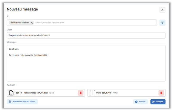 Pièces jointes dans la messagerie – Les usagers MSS et ESS peuvent maintenant joindre jusqu’à 3 fichiers à un message dans la messagerie. Les pièces jointes sont disponibles dans les applications Mobile et Web.