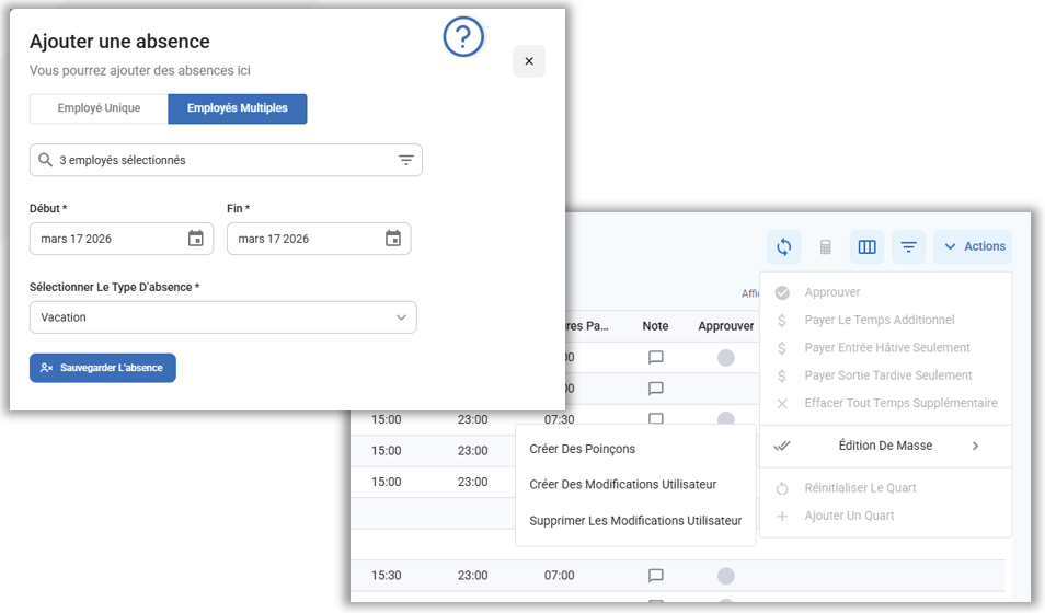 Créer des absences, des poinçons et des transactions pour de multiples employés – Créez une absence pour de multiples employés à partir du nouvel onglet d’employés multiples dans l’écran des absences et créez en masse des poinçons et des transactions à partir du menu Actions dans l’éditeur de carte de temps.