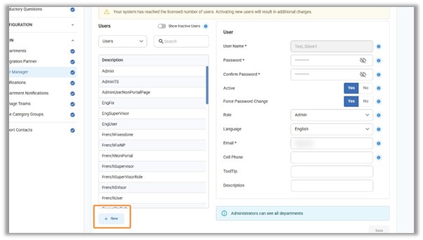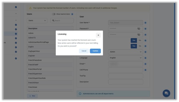 Upon clicking the New button, or clicking Yes to reactivate an inactive user account, a prompt will inform the user about the licensing limit and any additional costs that will be incurred.
