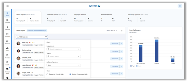Employee Selector on the Home screen – Users can now filter the Period Signoff and other dashboard widgets using the full employee selector. Users can easily multi-select employees, or filter by department or teams directly on the Home screen.
