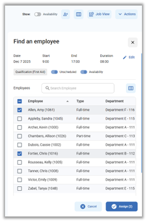 Employee Picklist – A scheduling user can use the Picklist to identify employees based on various criteria (e.g. target shift, qualifications, availability, etc.) and quickly create schedules for them.