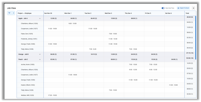 Job View – Job view will allow users to view the scheduled jobs and scheduled departments for selected employees in a chosen date range. This can be used to ensure that departments or jobs have the required coverage and that no assignments have been missed.
