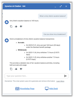 SAI is now smarter and can answer questions related to an employee’s accrual balances, employee schedules and labor allocation, as well as original vs. edited punches in the system.