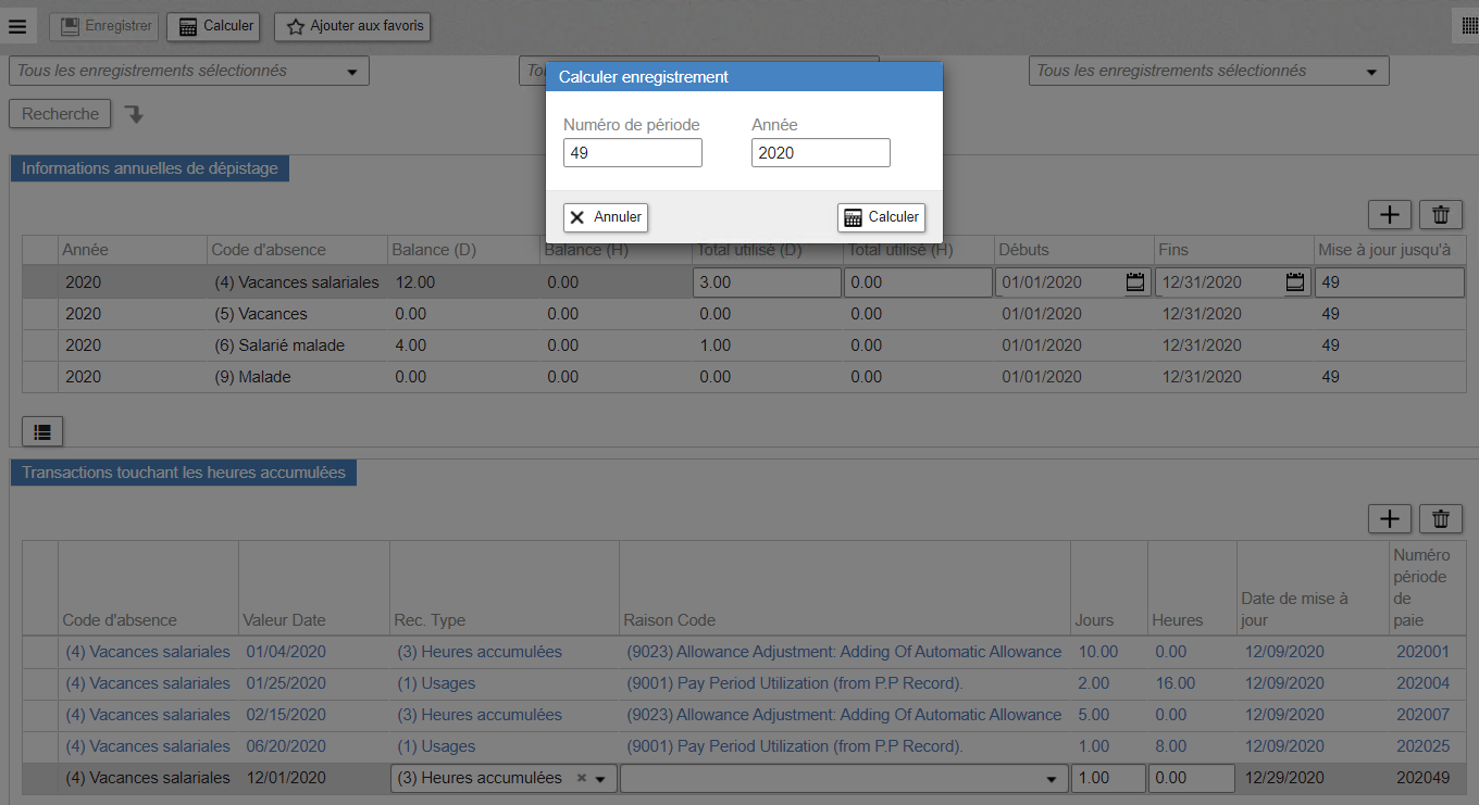 Remarque: si vous ajoutez le solde des périodes de paie précédentes, vous devez recalculer chaque période de paie, en commençant par celle où vous avez effectué le changement et en avançant de manière que le solde soit correct. Dans le cas présent, j’ai ajouté l’enregistrement à la période de paie 49 ; cependant, si je l’avais ajouté à la période de paie 48, je devrais calculer la période de paie 48, puis la période de paie 49.